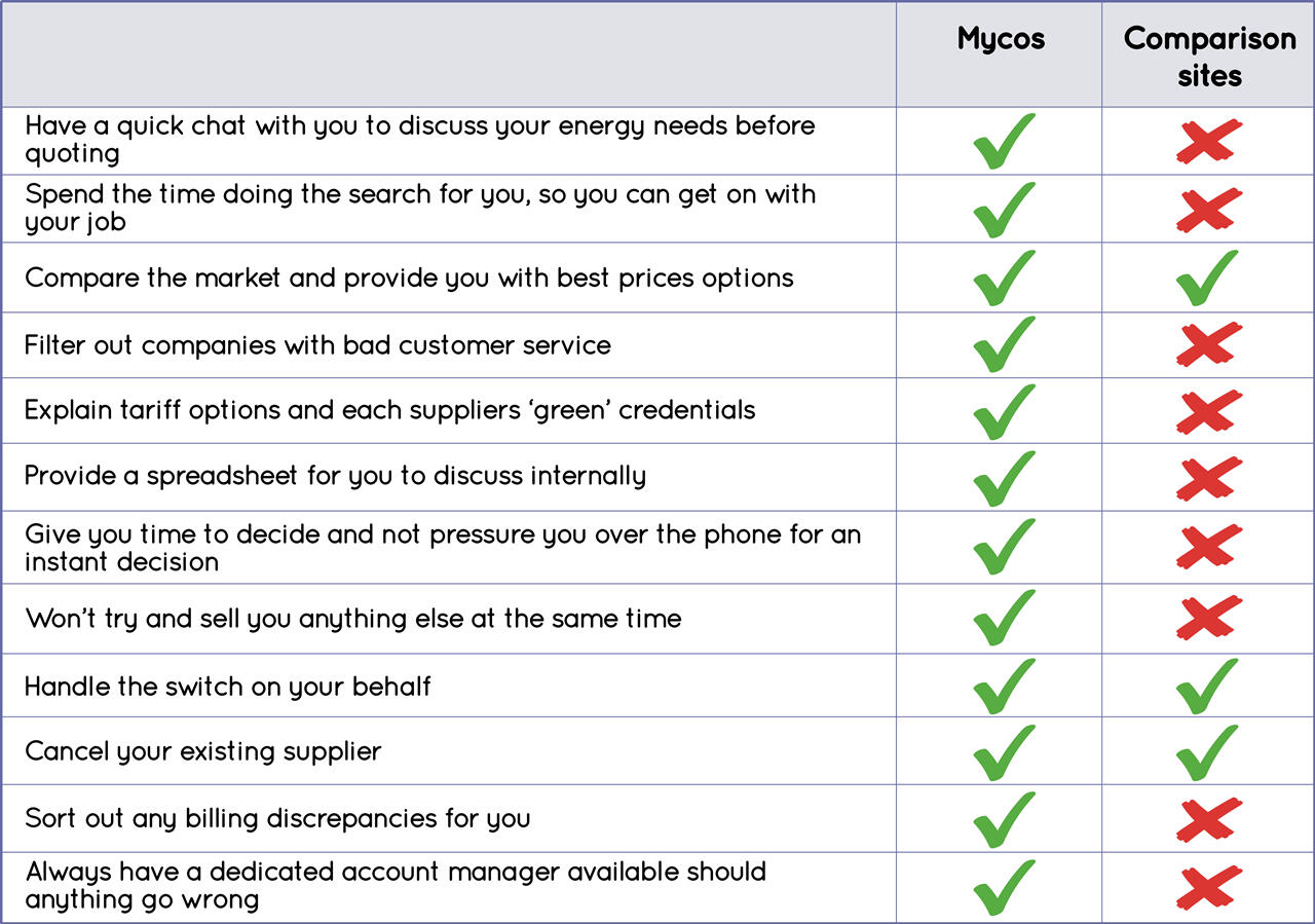 At Mycos, our mission can be summed up simply by three things: Better solutions, better value, better service.• Better solutions: Helping you do your bit to help reduce climate change.• Better value: Saving you money on business energy bills.• Better service: Providing a level of customer service that you are so happy with, you will to tell your